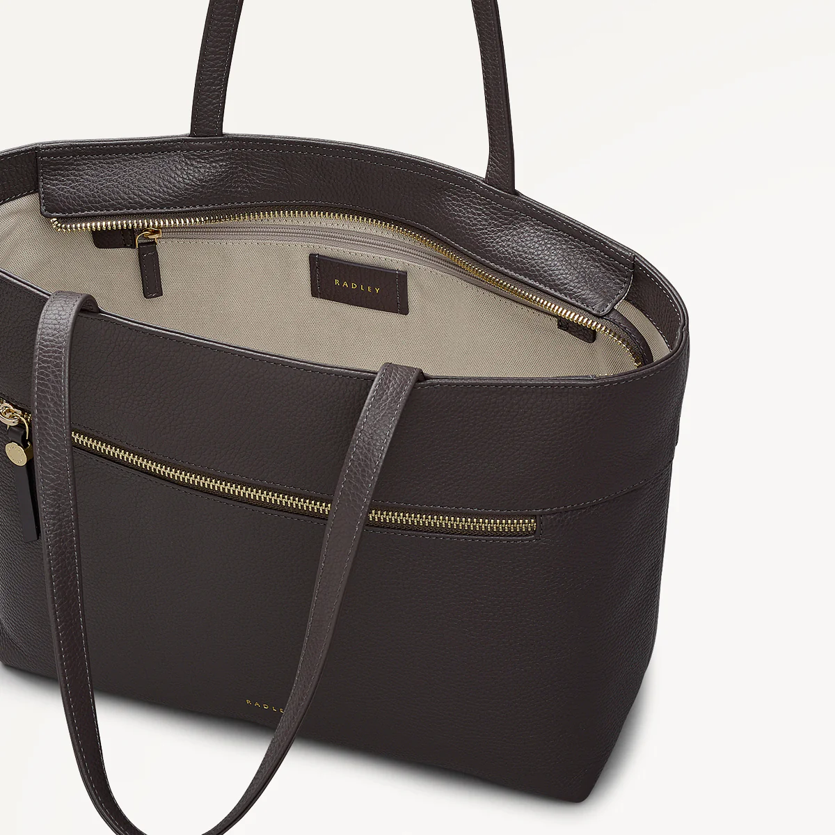 An update on a previous Radley collection, this Fountain Road tote features the same sleek and spacious design. It's crafted in grain leather with an east - west shape, slim handles and set down zipper closure with those signature long leather zip pullers.