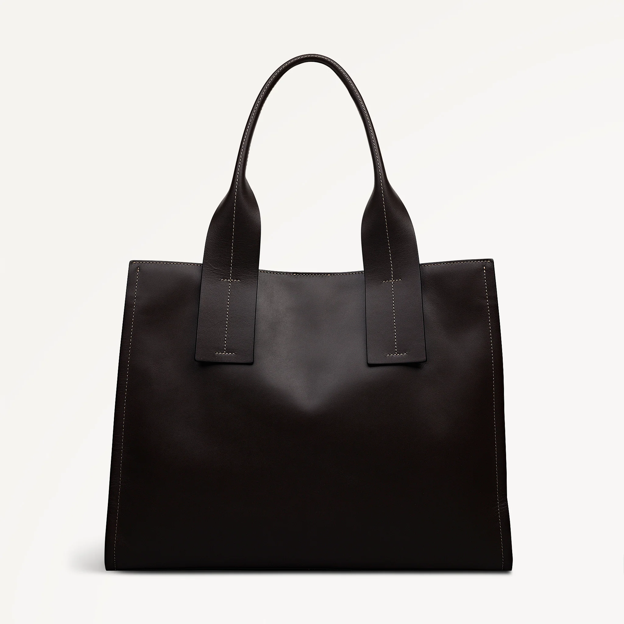 - Exaggerated wide handle tabs with central stitching